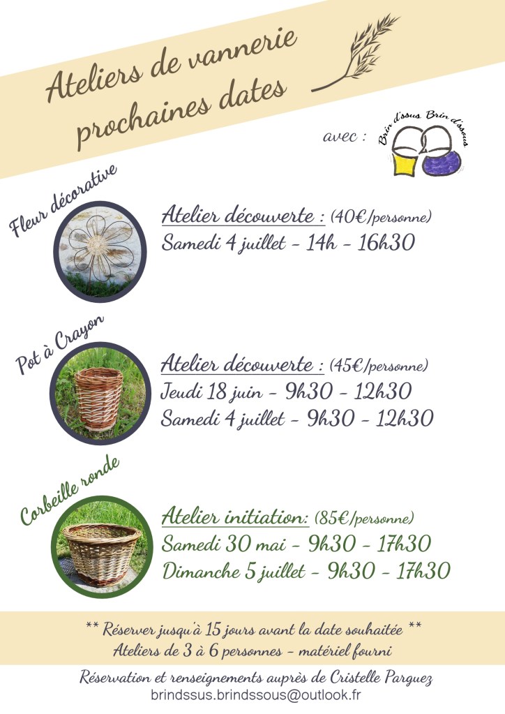 Notez un petit changement dans les dates ! Jeudi 18 juin de 9h30 à 12h30 Un atelier découverte pour le pot à crayon a été programmé. Vous n’avez jamais fait de vannerie ou vous n’êtes pas encore très à l’aise avec la pratique, ce stage vous permet d’aborder les 1er points techniques qui vont vous…