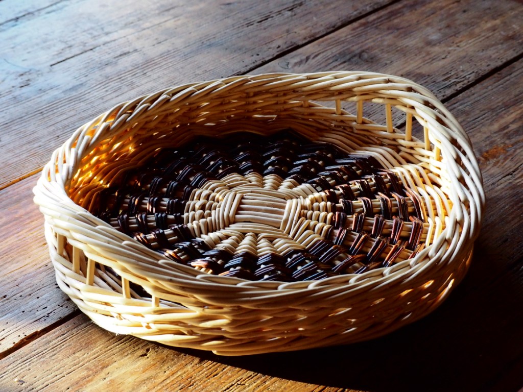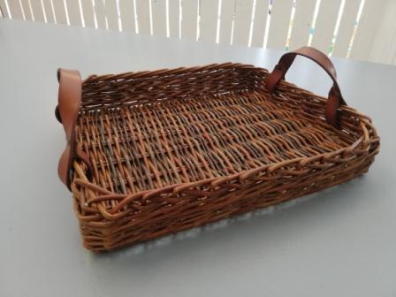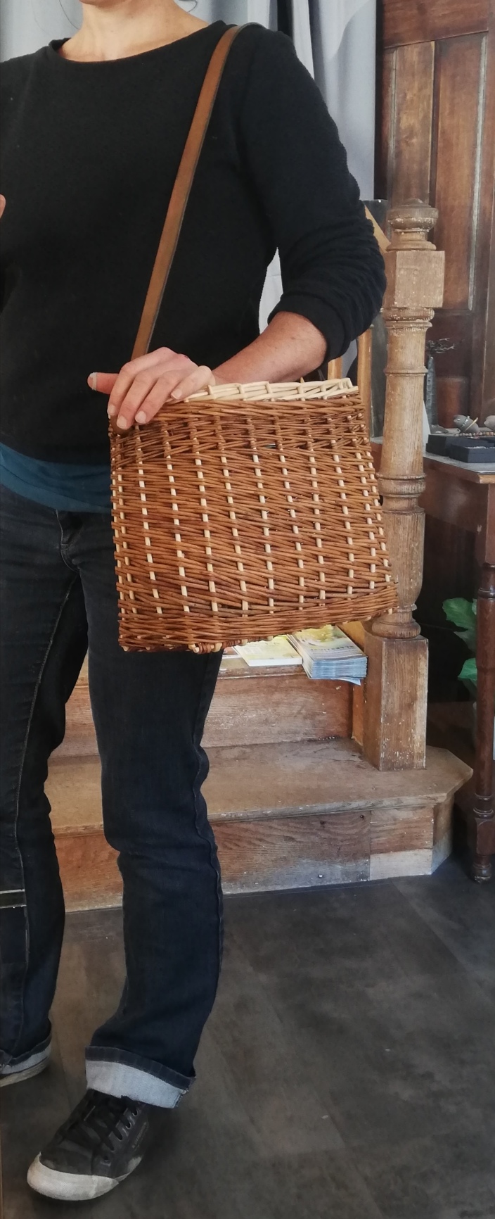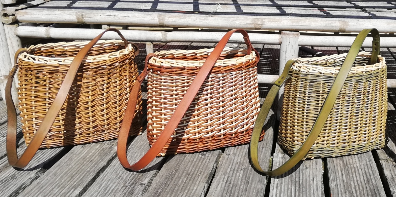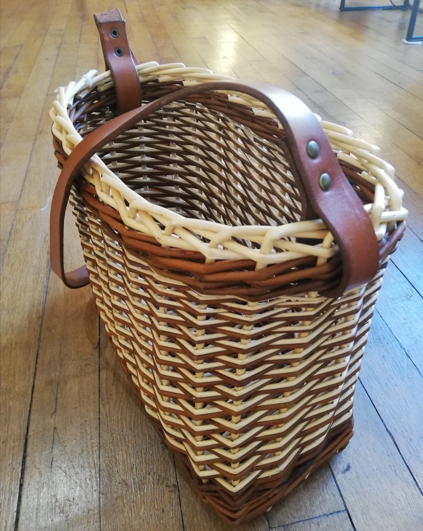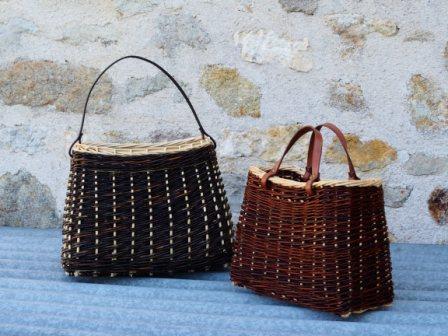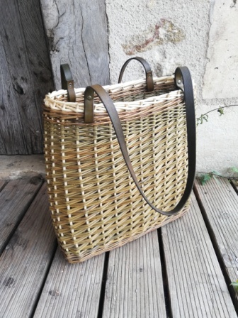 Le cuir utilisé sur certaines vanneries est travaillé par mes soins. Je le découpe, le teinte pour que la couleur soit en accord avec l’osier utilisé, puis le protège avec un mélange cire d’abeille/huile d’olive.